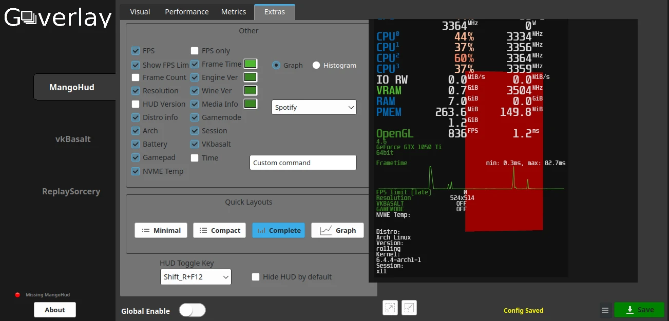 「MangoHud」是一款專為Linux系統設計的開源軟體,能在螢幕上即時顯示系統CPU、GPU、RAM、FPS、電壓、現在正在聽的音樂的資訊。