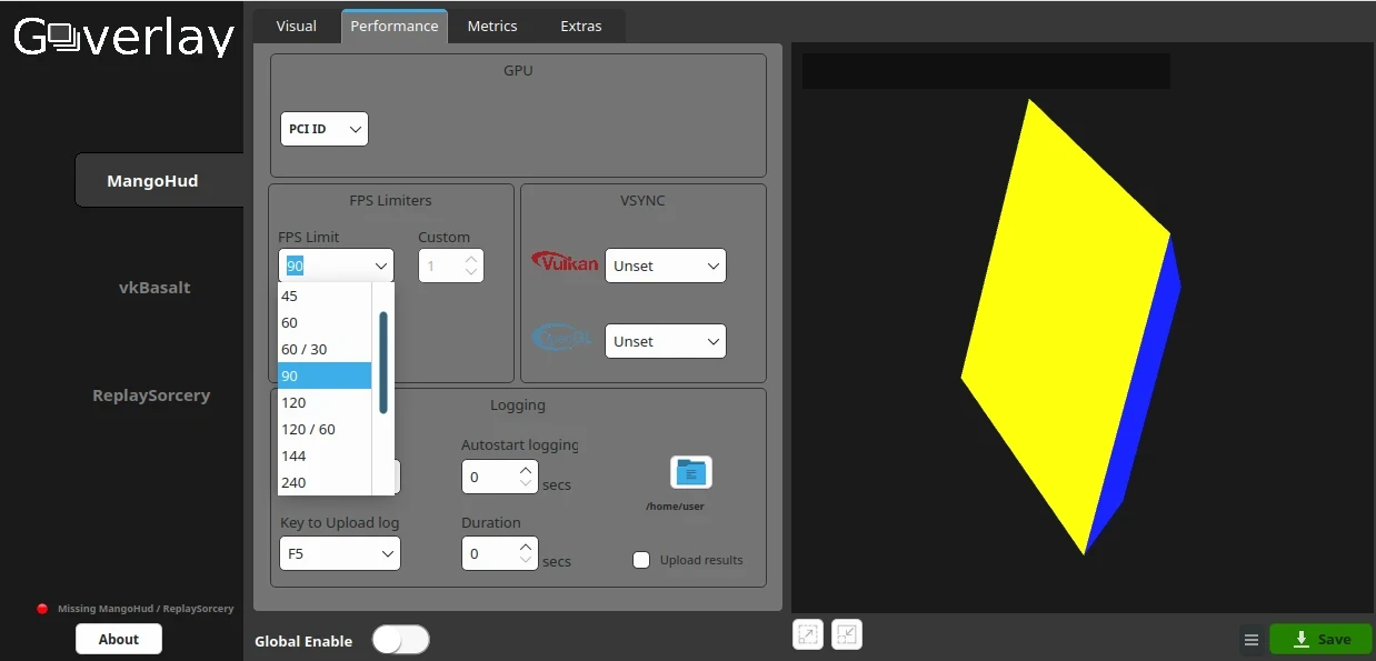 Position處調整MangoHud顯示的位置。Size設定MangoHud的整體大小。Performance頁面有一個FPS Limiter功能,用於限制遊戲執行時的最高FPS(遊戲中按F1切換),減少電腦耗電量,或者是防止遊戲幀數過高出現畫面撕裂情形。