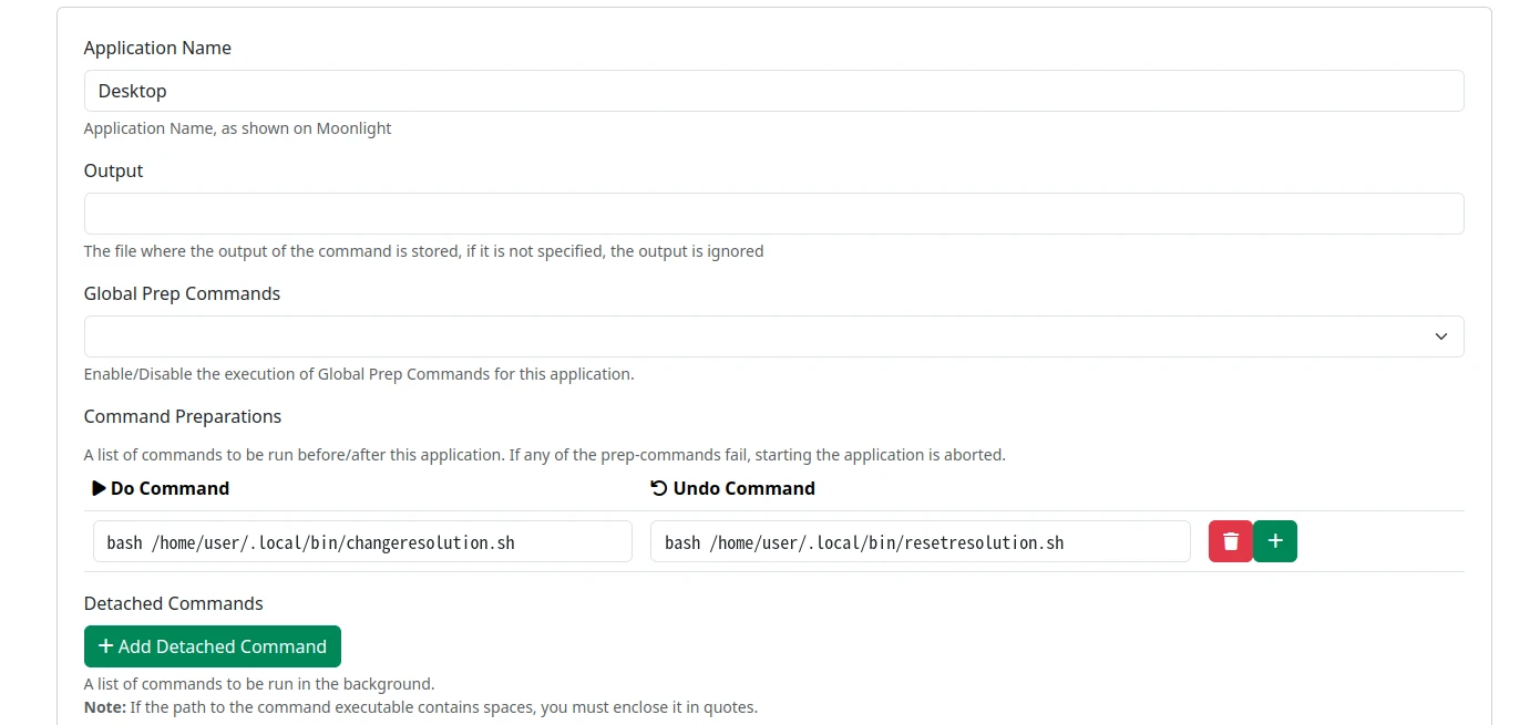 Moonlight客戶端雖然可以指定解析度,但是電腦端的Sunshine並不會跟著變化。所以我們得設定hook,利用Sunshine的「Custom Application」功能,自訂啟動桌面後執行指令,自動執行xrandr調整解析度與縮放,關閉遠端桌面之後再自動切回去。