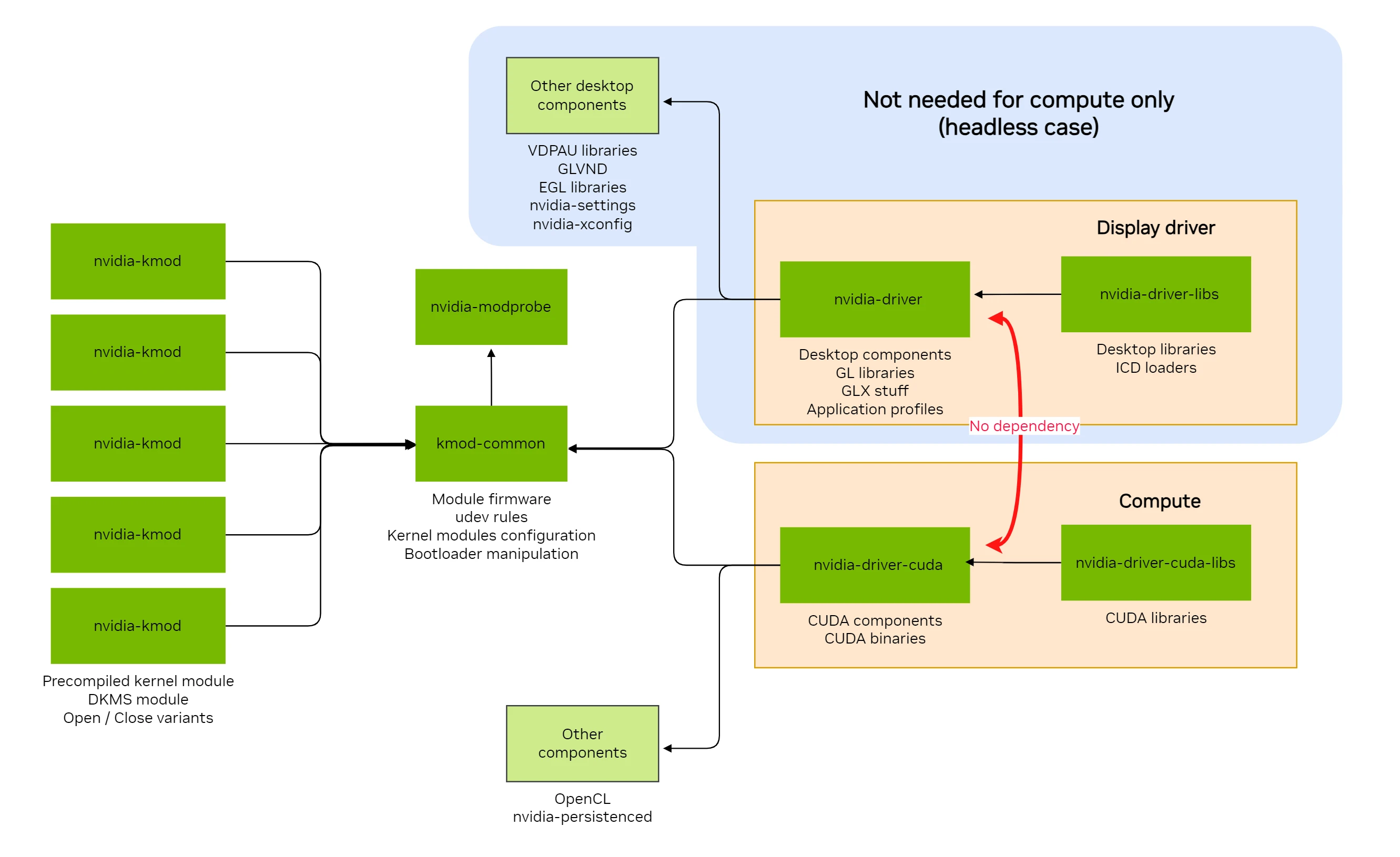 下圖來自Nvidia官方文件,說明了Nvidia驅動各個部位負責的部份。如果Linux伺服器只要跑CUDA計算,不需要輸出畫面,那就只要裝右下角那一塊的Nvidia Compute驅動就好了(所以你會在Ubuntu的套件庫看到-headless或-server後綴的Nvidia驅動套件)。但是對Linux桌面使用者而言,需要安裝右上角那一塊的驅動。那如果同時要用Nvidia驅動輸出畫面和跑CUDA計算,就是兩個都安裝了!而圖形輸出這一塊就正好是Nvidia驅動問題最多的地方。