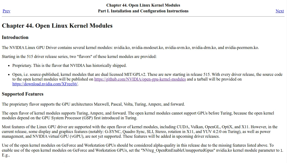 Nvidia將閉源驅動的大部分功能移植到open GPU kernel module後,便開始建議使用者安裝這個版本,不過這個驅動需要相對新穎的顯示卡才能安裝,舊卡還是只能使用閉源驅動。