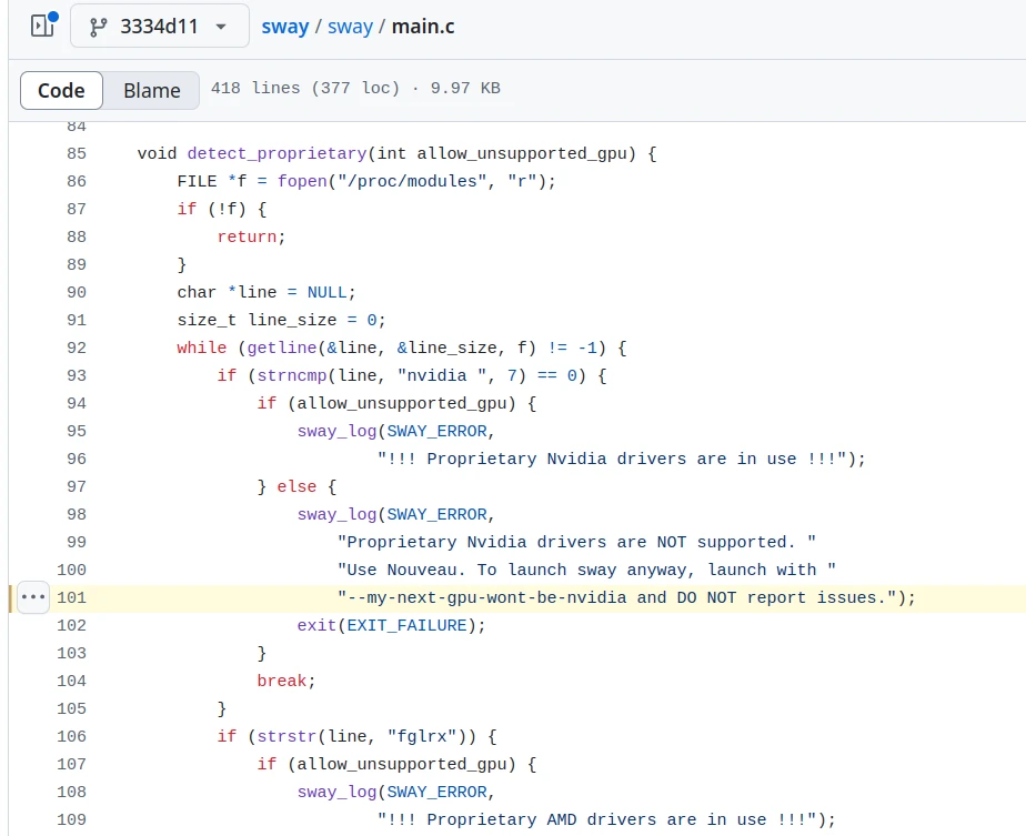 範例:以前Wayland合成器Sway的原始碼,因為Nvidia閉源驅動問題太多,所以Sway要求使用者加入「我不會再買Nvidia顯示卡」的參數才能啟動不穩定的桌面,後來改成中性的unsupported-gpu。
