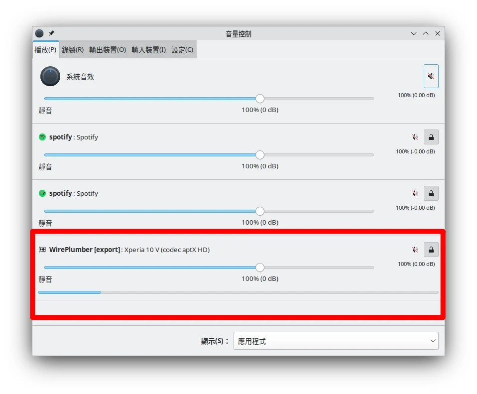 Linux的pavucontrol面板可以觀察到有手機的播放訊號源