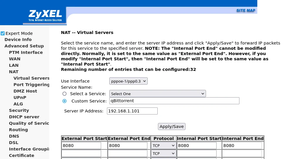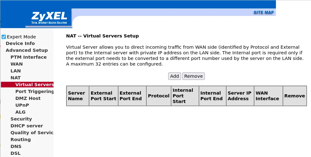 Expert Mode,Advanced Setup的NAT裡面就會出現Virtual Servers,功能等同port forwarding。按下Add。