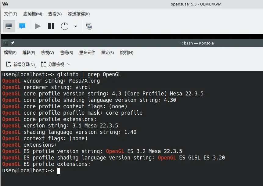 6. 因為VirGL預設僅支援OpenGL,所以要用OpenGL工具來測試。使用glxinfo | grep OpenGL指令可得知,這裡使用了virgl,而非純CPU算繪的llvmpipe。