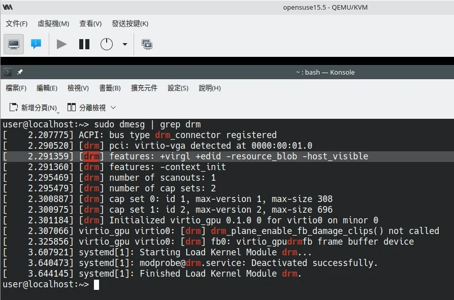 5. 在虛擬機執行dmesg | grep drm指令查看virgl是否有載入