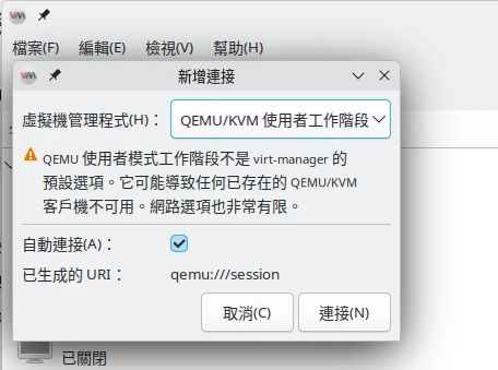 1. 點選Virt Manager的檔案 → 新增連接,改成連接到QEMU使用者工作階段