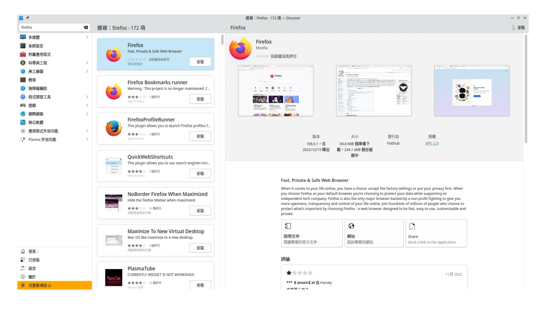 應用程式商店。開啟Linux應用程式商店搜尋軟體安裝。Ubuntu、Fedora、Arch Linux都有內建軟體商店,在這裡您可以按照分類探索軟體!