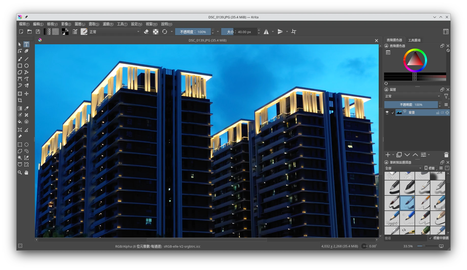 | Krita | 專業電腦繪圖軟體,支援繪圖板與自訂筆刷,可以繪製插畫、漫畫、動畫,類似Clip Studio Paint。因為介面操作類似Photoshop,所以也可以拿來修圖,編輯.psd檔案。支援AI生成繪圖。 詳細使用方法 |