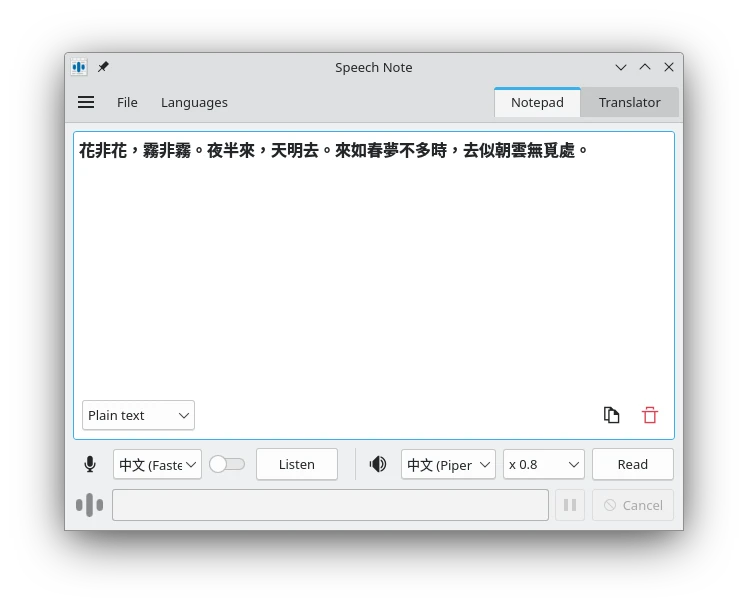 Speech Notes值得一試,兼具語音辨識與文字轉語音的功能,中文支援度更佳。可以用來製作逐字稿與合成講話聲音。