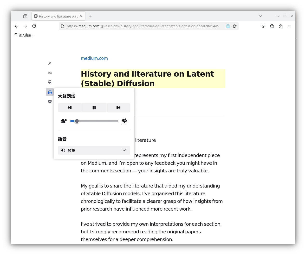 Firefox點選對應語言的網頁,進入閱讀器模式,使用Speech Dispatcher朗讀,發聲便會是剛剛Pied所設定的聲音。