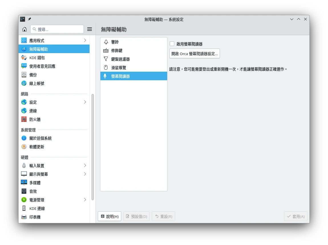 如果你要全域朗讀畫面上的文字,那麼就開啟桌面環境的無障礙輔助工具,開啟螢幕閱讀器,讓它唸出標題文字。Linux有叫做Orca的程式能調整螢幕閱讀器的設定。