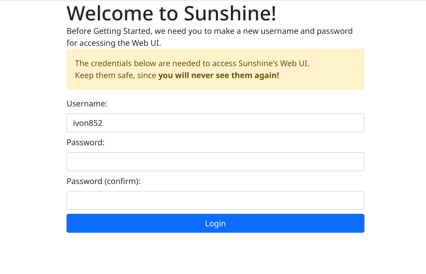 https://localhost:47990,設定Sunshine後台的帳號密碼。