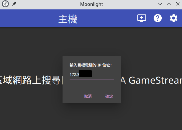Moonlight客戶端連線會找不到ZeroTier網路上的電腦,請直接按右上角以ZeroTier分配的區域IP新增電腦: