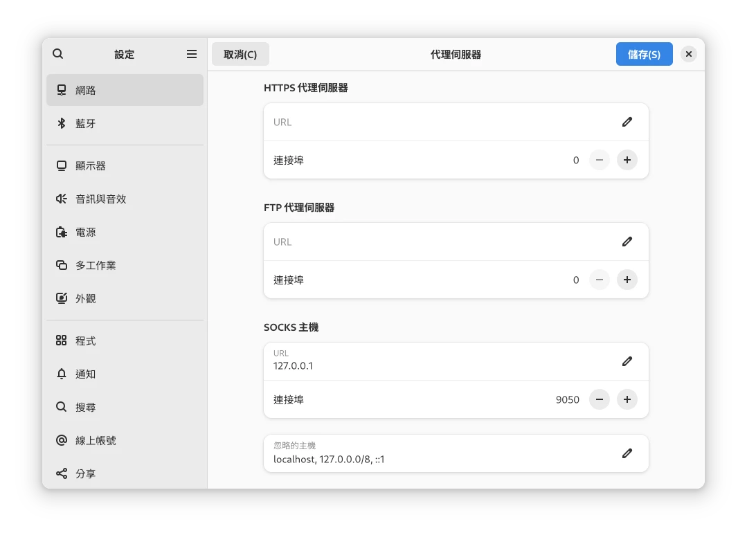 GNOME:系統設定 → 網路 → 代理伺服器,填入SOCKS伺服器位址。