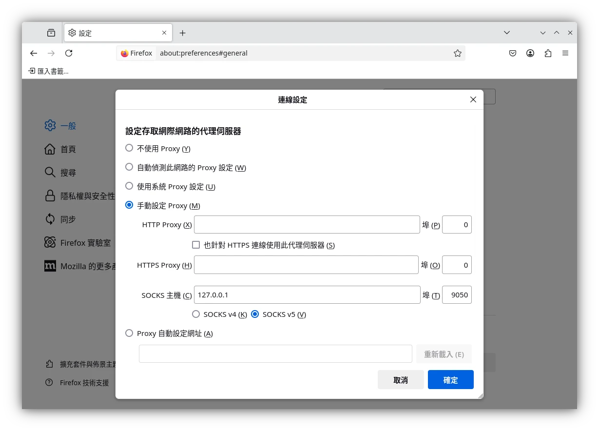 Firefox到設定 → 一般 → 網路設定,手動指定代理伺服器位址。