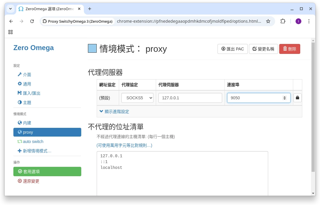 Chromium系瀏覽器會沿用系統的代理伺服器。需要安裝Proxy SwitchyOmega擴充功能,才能手動指定代理伺服器。