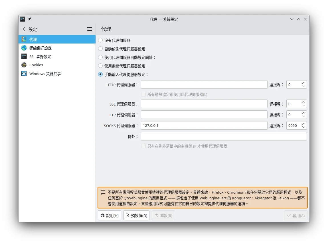 KDE Plasma:系統設定 → 網路設定 → 代理,填入SOCKS伺服器位址。