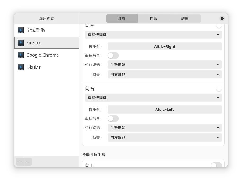 另外瀏覽器的上一頁快捷鍵通常都是Alt和方向鍵,因此我另外設定了三指滑動返回上一頁的設定。這樣就不需要移動滑鼠了。