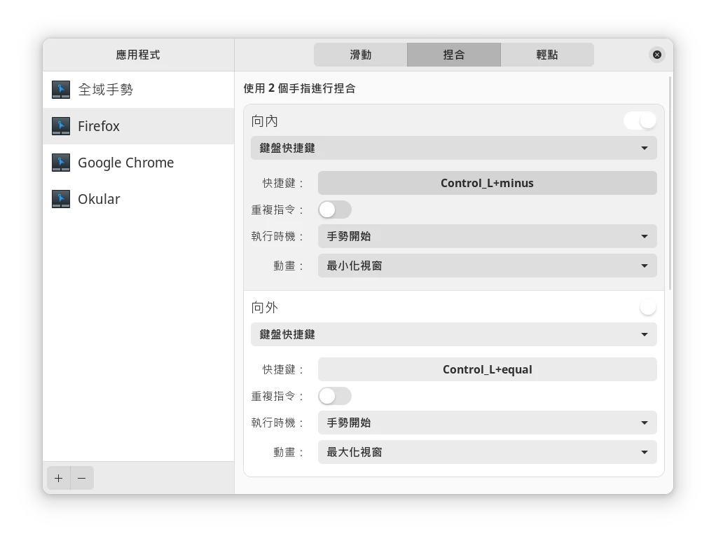 例如給Firefox設定二指放大視窗的手勢。然而這跟Wayland工作階段的無縫放大不一樣,你可以看到圖中的二指捏合是執行CTRL和+號的快捷鍵,而非真的放大畫面,這算是小缺陷。