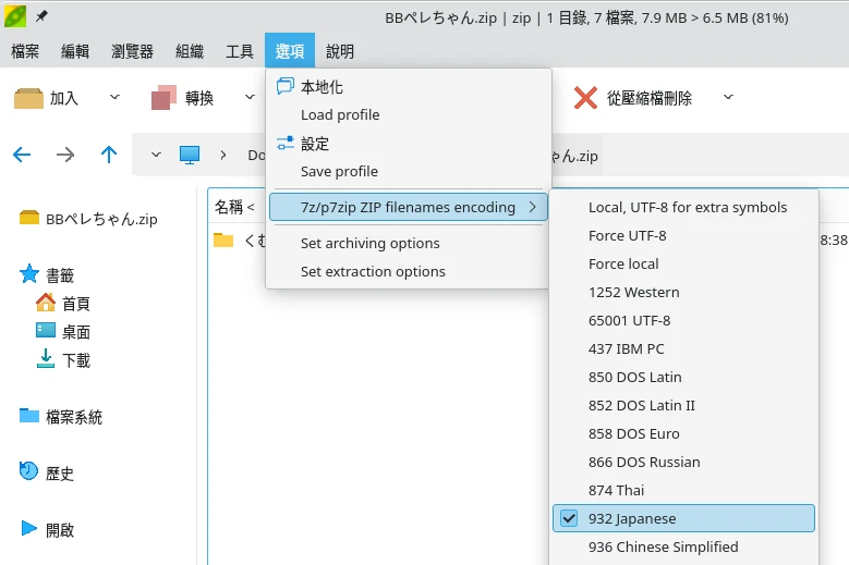 若是日文檔案,右鍵以PeaZip開啟,點選選項 → 7zip filenames encoding,選取932 Japanese的頁碼,解壓縮出來的檔案就不會亂碼了。