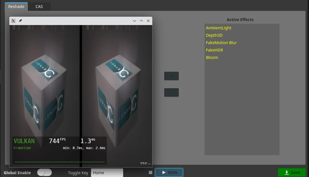 點選右下角Save儲存。按一下RUN,就會跑出測試用的Vkcube方便觀察效果。在執行過程中,按Home鍵可關閉vkBasalt的特效。