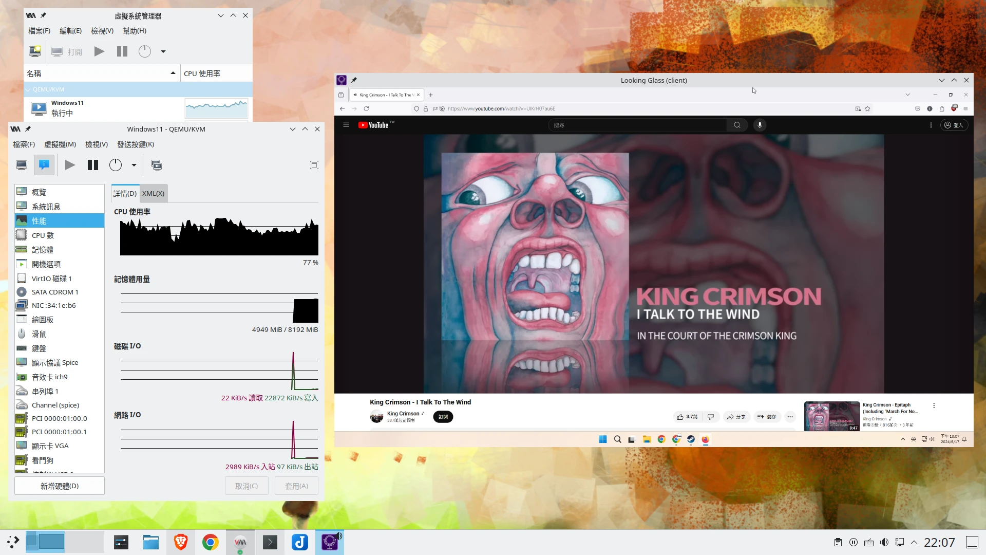如果Windows虛擬機有連線那麼應該就會看到桌面,此時Virt Manager的畫面會黑掉。