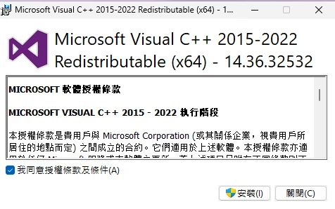 在虛擬機內安裝最新Microsoft Visual C++可轉散發,檔名為