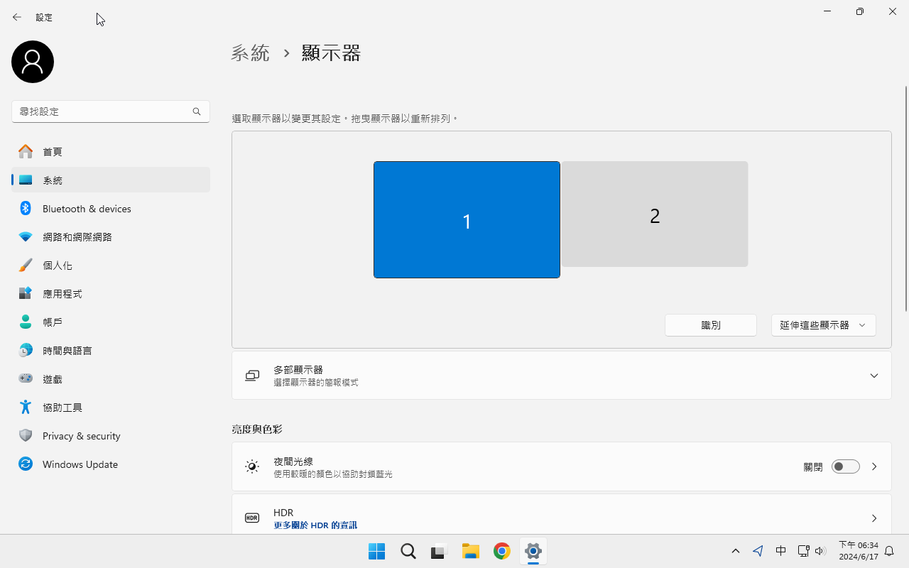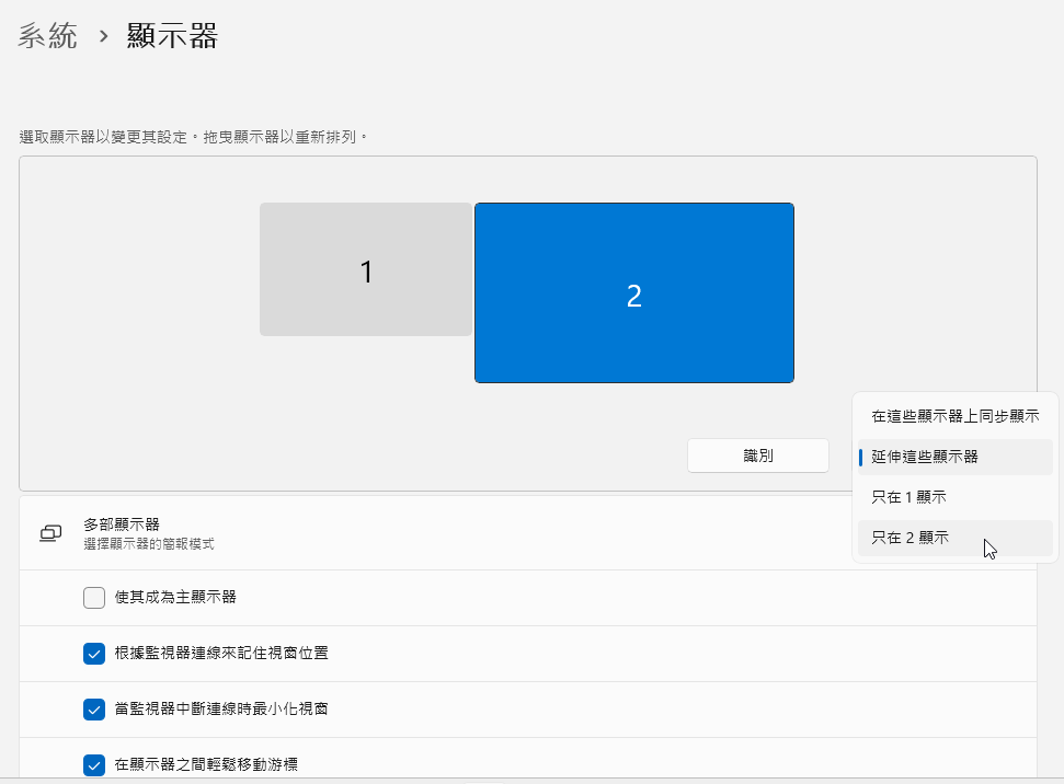 開啟Windows系統設定 → 顯示,現在應該會看到二個螢幕