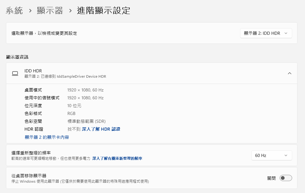 點選第二個螢幕 → 進階顯示設定,確認這是Virtual Display Driver生成的螢幕