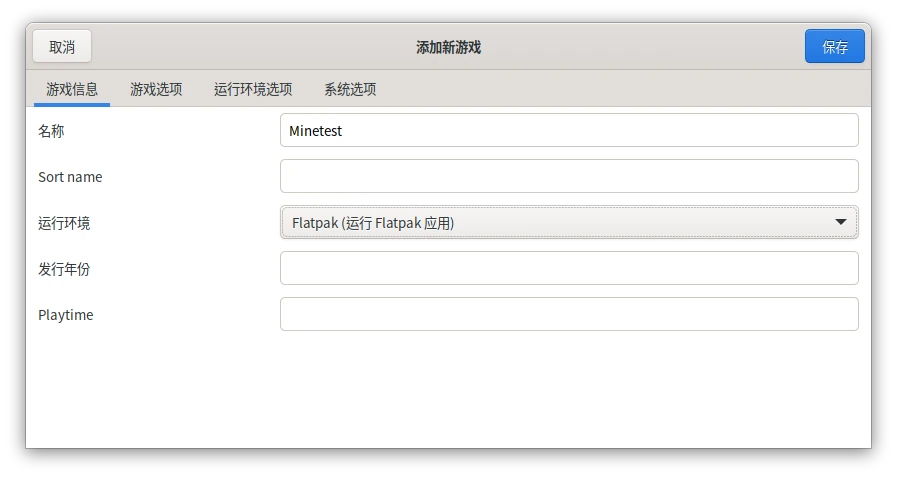 1. 例如我這裡有用Flatpak安裝的Luanti,點選+號 → 手動配置遊戲環境,設定啟動指令。像這裡因為是Flatpak,所以運行環境勾選Flatpak