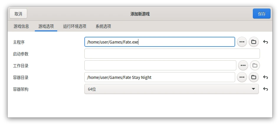 2. 遊戲選項填入EXE所在目錄,以及容器目錄。我的想法是仿效Steam,每個遊戲都建立一個目錄,擁有獨立的Wine Prefix,防止環境互相污染。參考Linux Wine指令使用教學。這裡的WINEPREFIX即Wine的模擬C槽所在路徑,自行挑選一個目錄,例如~/Game/wineprefix/<遊戲名稱>