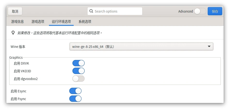 3. 運行環境選擇Wine版本。Lutris預設會自動給Wine啟用DXVK。