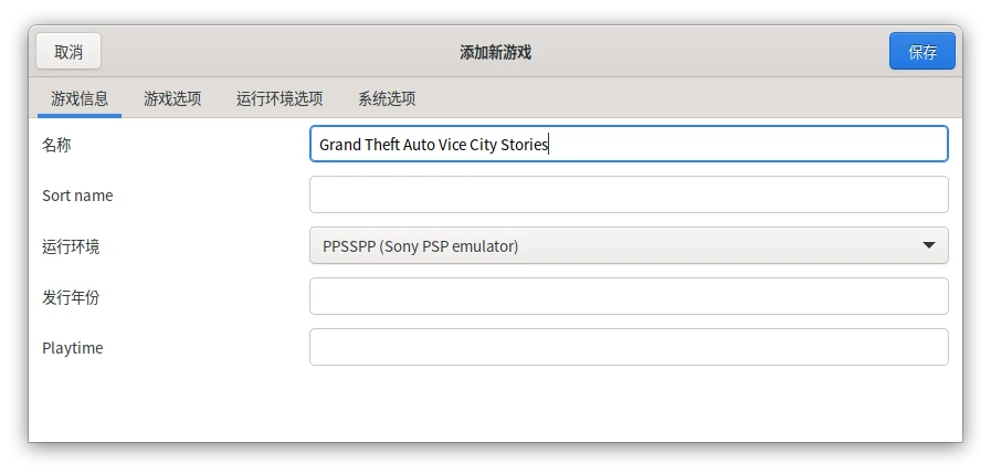 新增遊戲執行環境選取PPSSPP,再填入ROM路徑即可。其他模擬器所需的執行環境,可在Lutris首頁右上角按Preferences → 執行環境,手動下載。