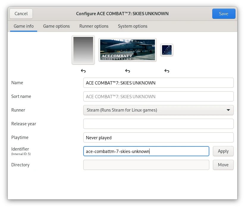 4. 這時你要對其按右鍵 → Configure,點選修改Identifier,Lutris線上資料庫無法辨識的遊戲會改以一組UUID替代。嘗試輸入Lutris官網的網址(例如https://lutris.net/games/ace-combattm-7-skies-unknown/就輸入ace-combattm-7-skies-unknown),這樣它就會應該抓到縮圖了。