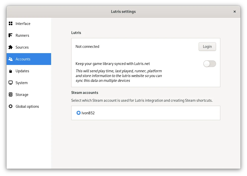 2. 點右上角 → Preferences → Accounts,點Login登入Lutris帳號,再點選Sync。