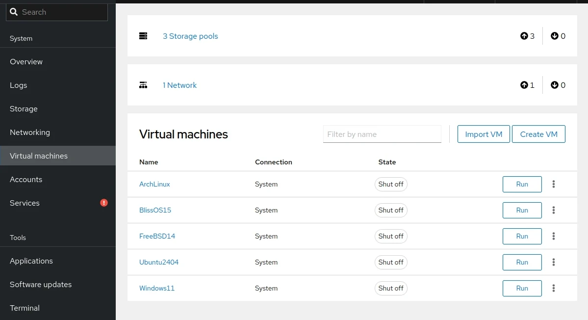 cockpit-machine套件,Cockpit網頁左側才會出現「Virtual machines」選單。點進去可以看到Linux電腦上的所有虛擬機
