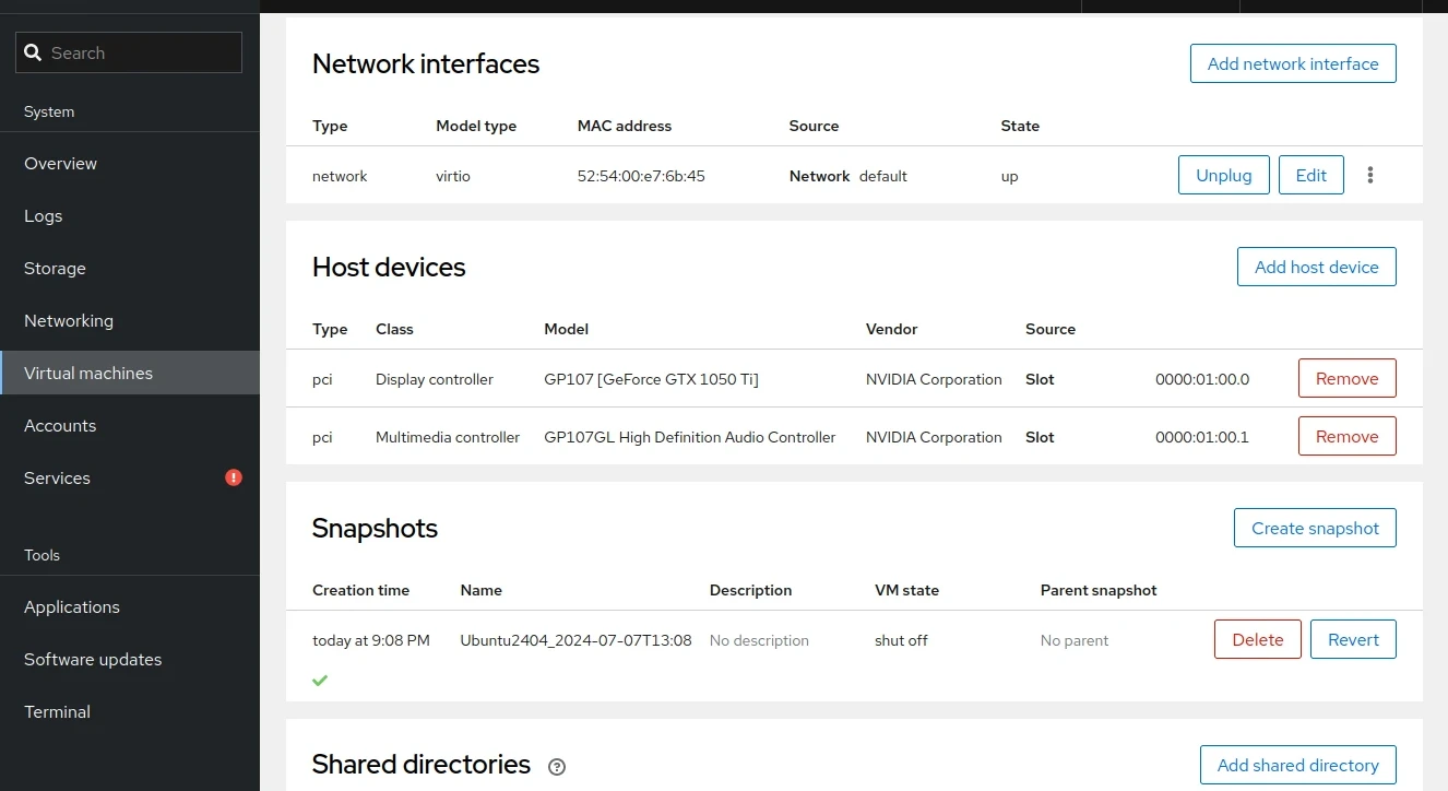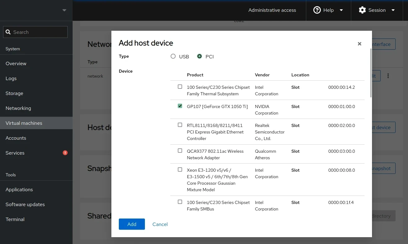確認Nvidia GPU隔離完成,就能在Cockpit選單,將Linux Host的Nvidia GPU指派給虛擬機使用了。
