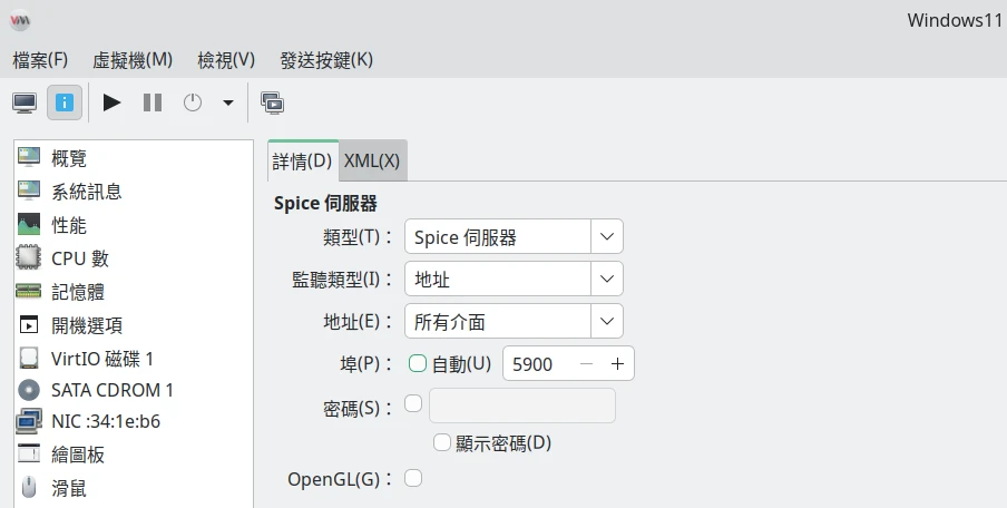 不過Virt Manager新增的虛擬機預設應該是以SPICE為主,這個時候得確保該虛擬機的SPICE正在監聽所有網路界面: