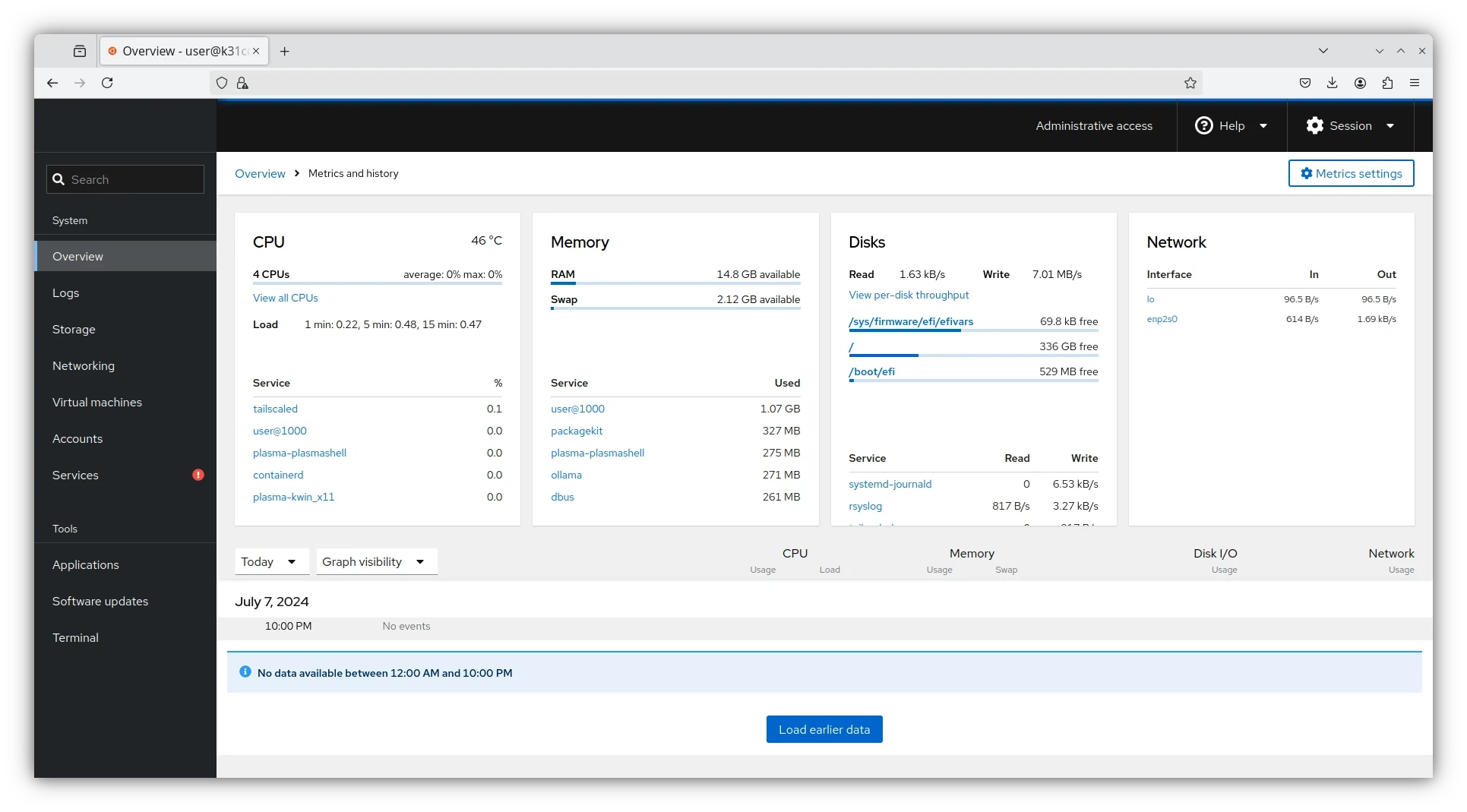 咦?Cockpit看起來有點像在用Proxmox的面板耶?因為它功能不只這個!Cockpit除了管理虛擬機之外,還可以調整Linux系統的各項設定喔!例如開啟網頁終端機、設定網路界面、調整firewalld防火牆、使用者群組管理、開關系統服務、管理Podman容器等等,可說是全方面的Linux網頁管理系統。