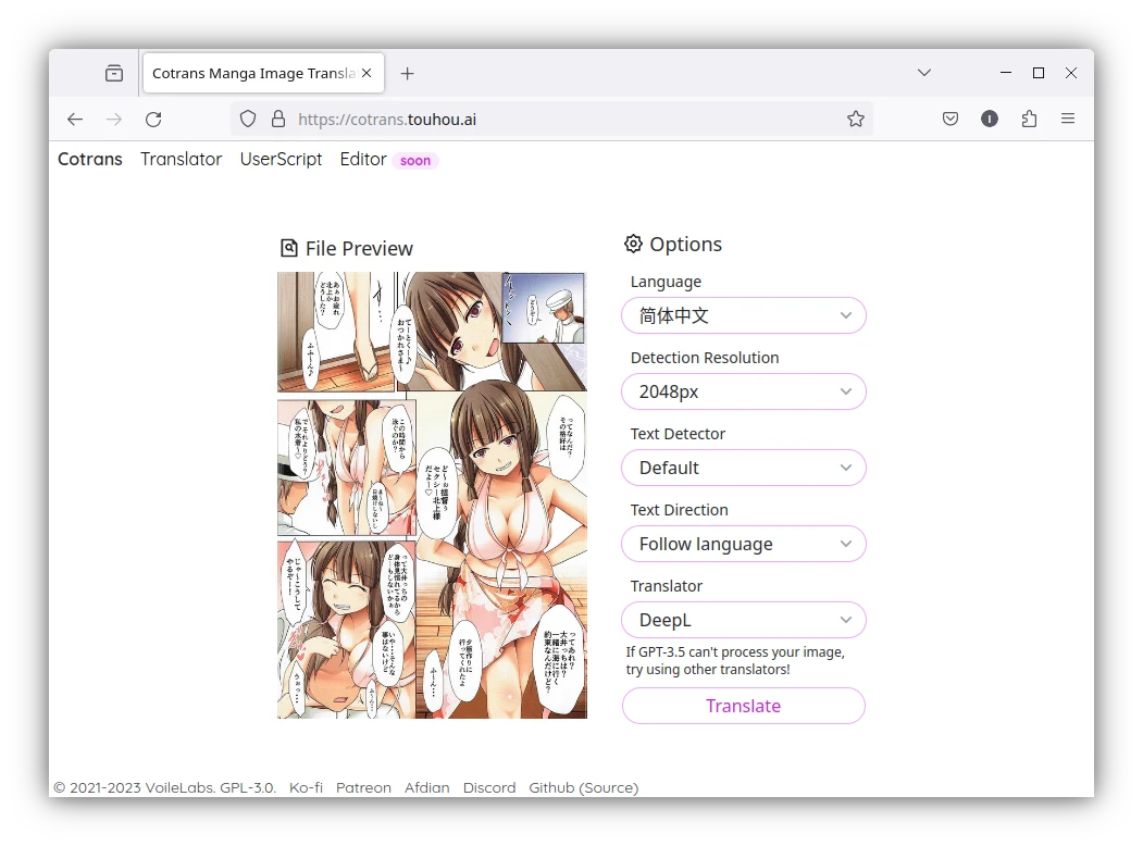 Manga Image Translator本體是偏向打指令執行的程式。您可以先用開發者提供的線上展示網站玩玩看,只要上傳圖片就會吐出翻譯結果!名字叫做CoTrans。網址:https://cotrans.touhou.ai