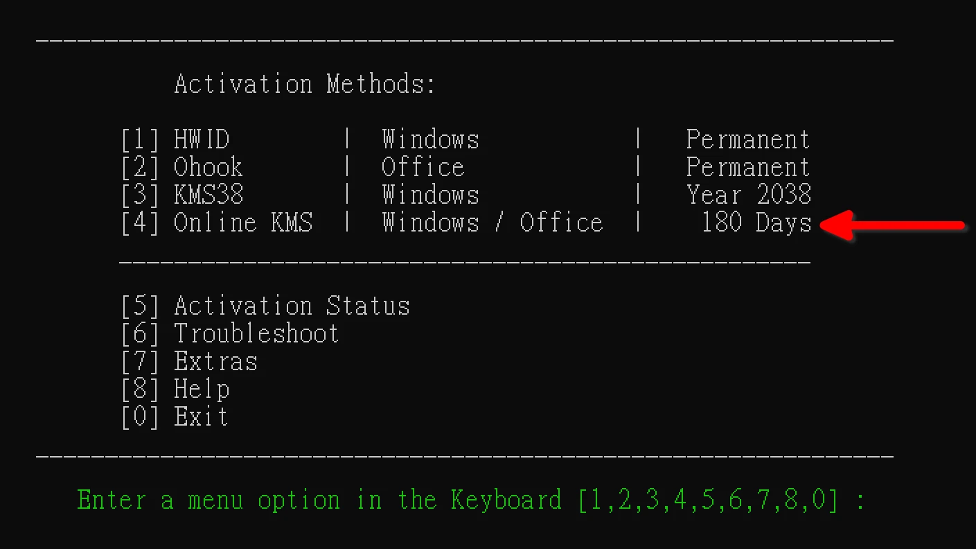 gatherosstate.exe,不斷延長180天的金鑰試用期,將失效日期一路延期到2038年。此方法無需網路,不會在系統留下任何檔案。 - Online KMS Activation:支援Windows 7 ~ Windows 11系統。利用Microsoft官方的Key Management Service線上啟用金鑰,每180天要連網重新啟用一次。此方法亦能夠啟用Microsoft Office產品。