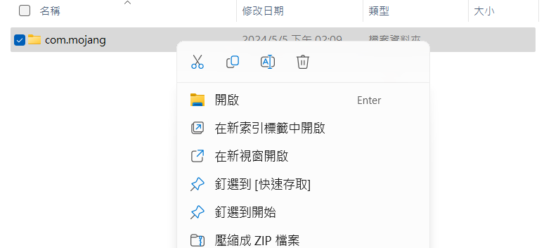 com.mojang資料夾。按右鍵,將其加入到檔案總管的快速存取
