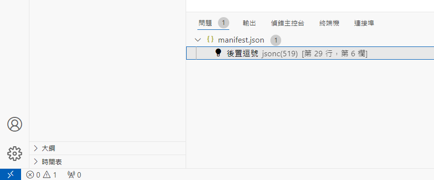 - Visual Studio Code是很智慧的編輯器,在後續你編輯JSON的時候,遇到語法錯誤它都會在左下角提醒你,可以幫你省掉許多不必要的除錯過程。