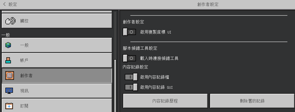 請開啟Minecraft,點選遊戲設定 → 創作者,勾選啟用內容記錄設定。