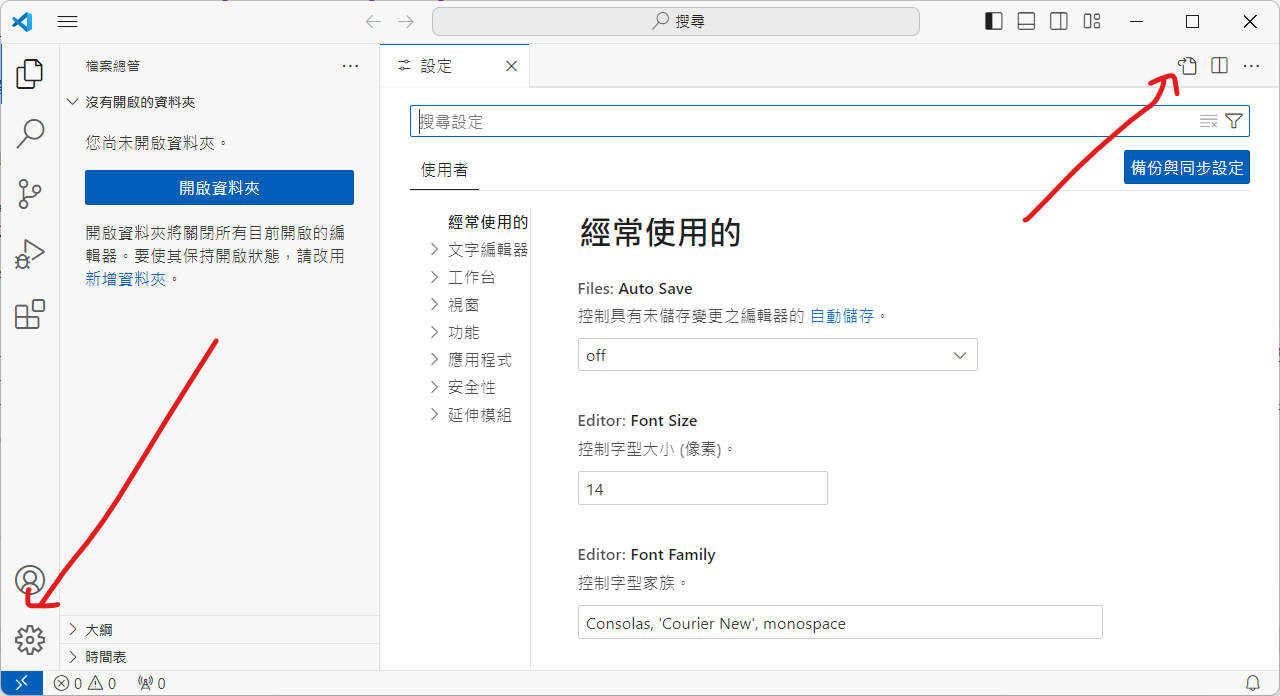 這個時候請點選左下角設定 ,再點選右上角開啟settings.json