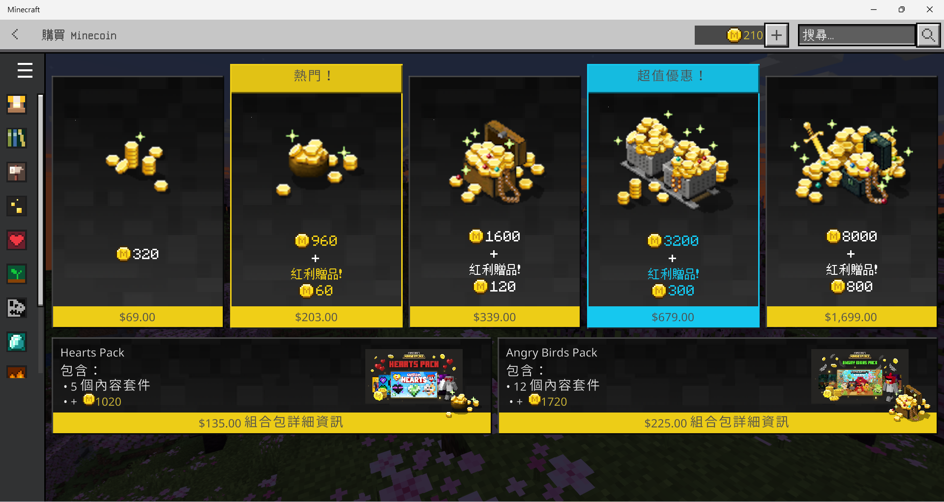 在購買市集內容前,你必須先用真錢購買名為"MineCoin"的代幣,然後再拿代幣去買你要的東西。Minecoin可以說是為了跨平台課金所準備的機制吧,這樣你不論是在Android或iOS,都可以用同樣的代幣來購買內容。