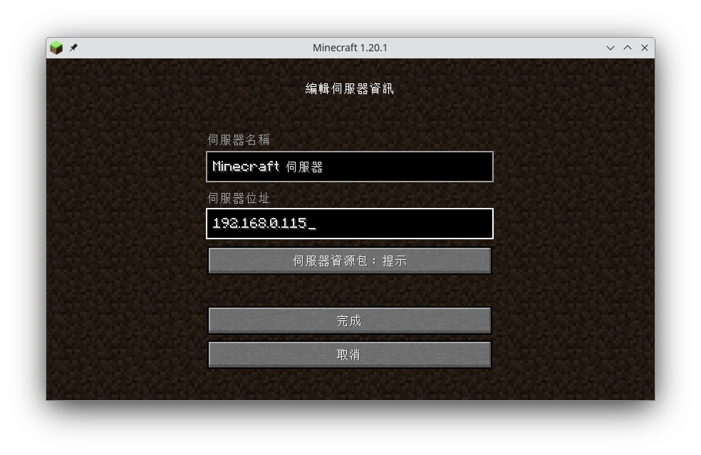 - 於同一區域網路下的電腦,開啟Minecraft,點選多人遊戲 → 新增伺服器,輸入
