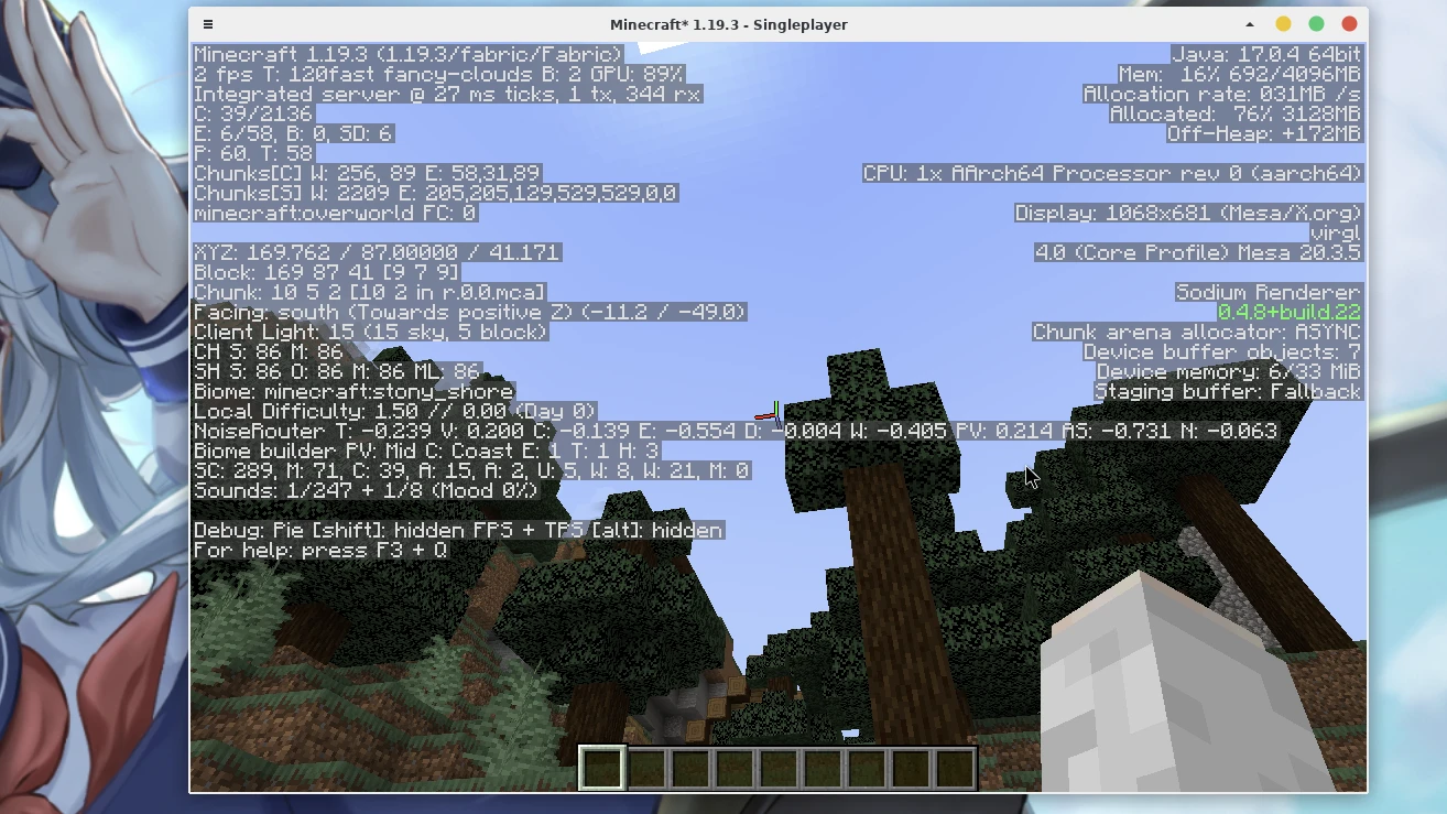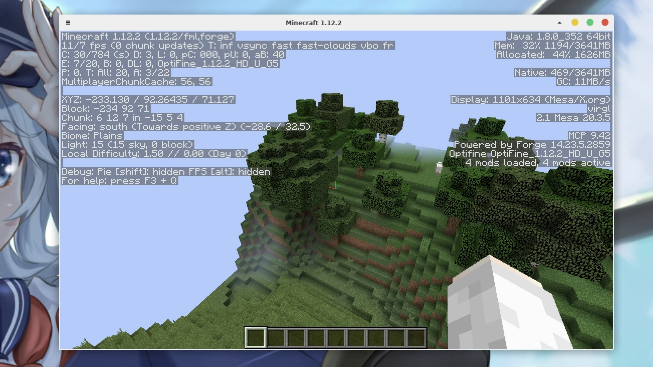virgl驅動已載入。跟新版本Minecraft比起來,舊版本安裝Optifine的FPS似乎要高一些。