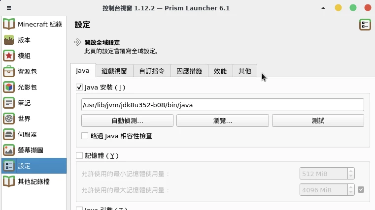 對1.12.2的圖示按右鍵,編輯實例,將Java的路徑設定為剛剛安裝的OpenJDK 8。